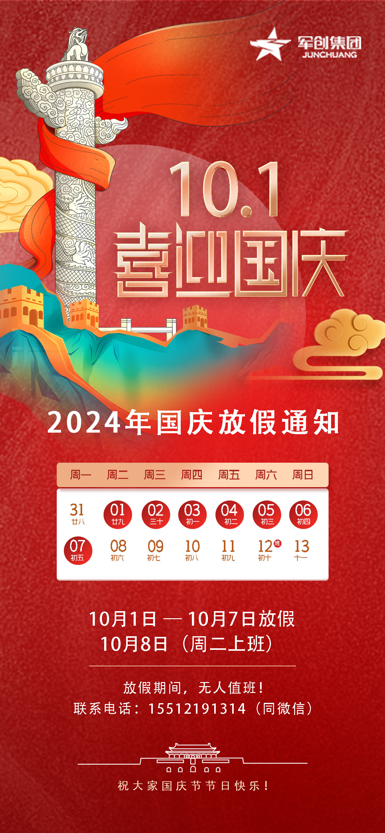 【河北军创】2024国庆节放假通知